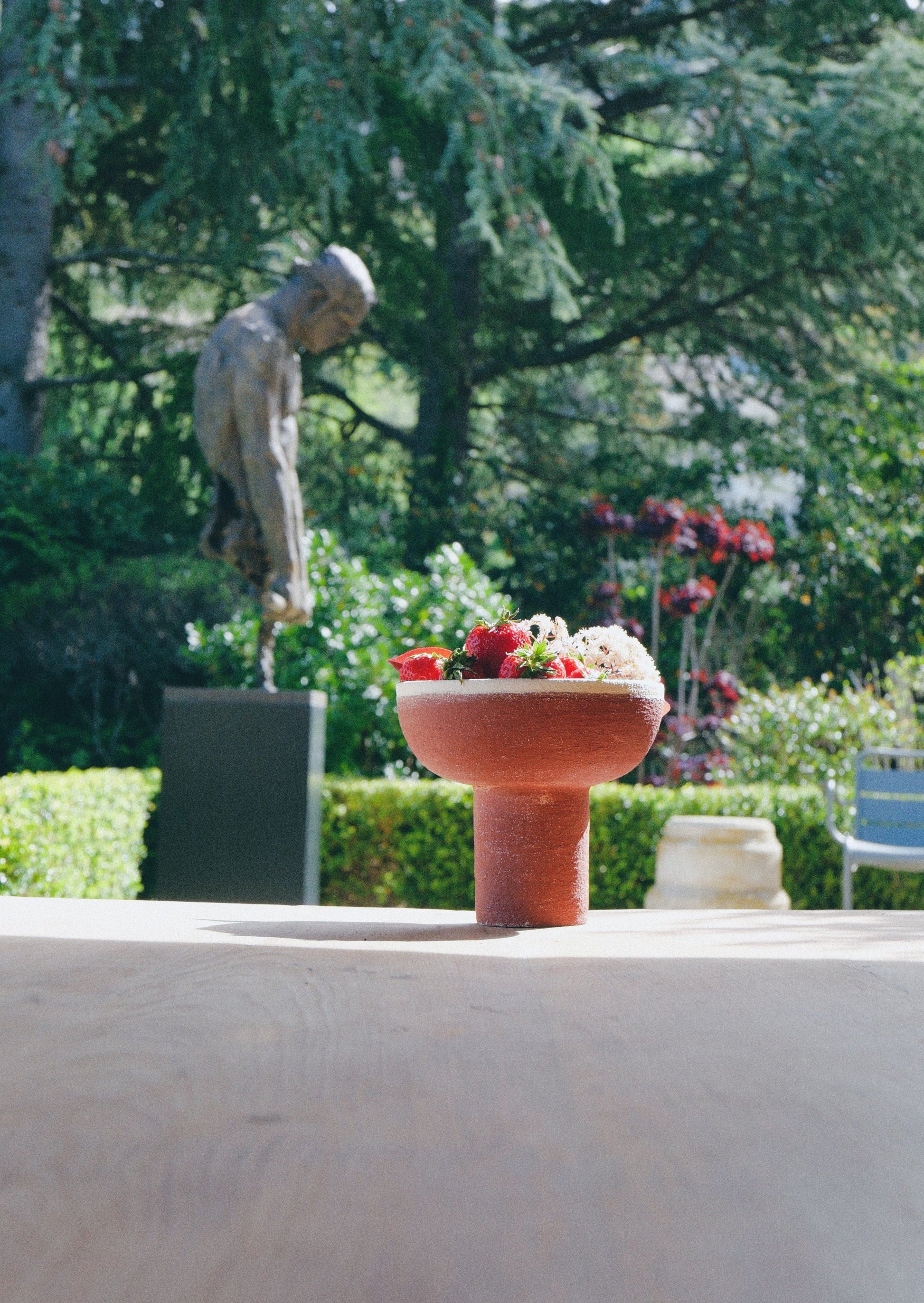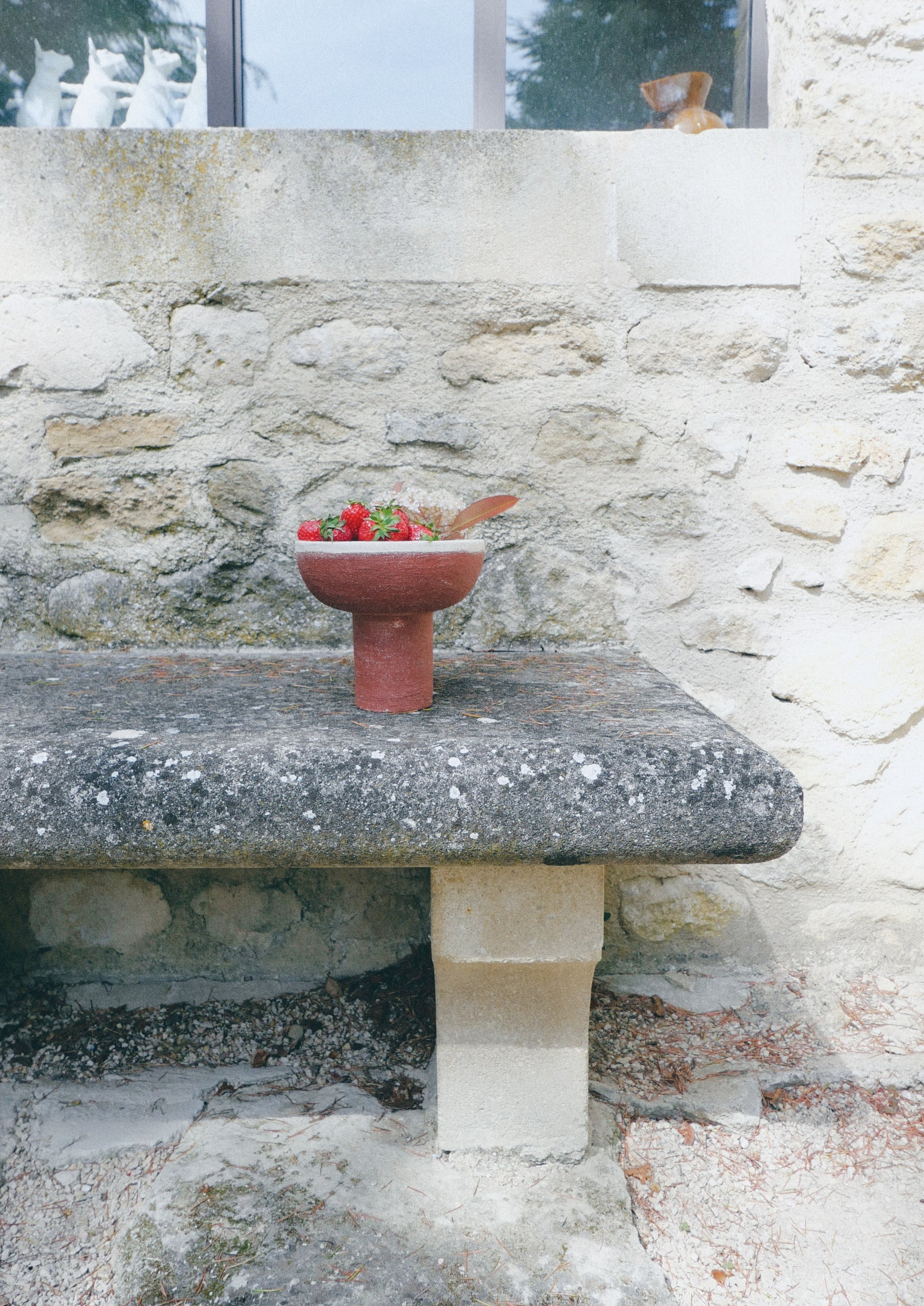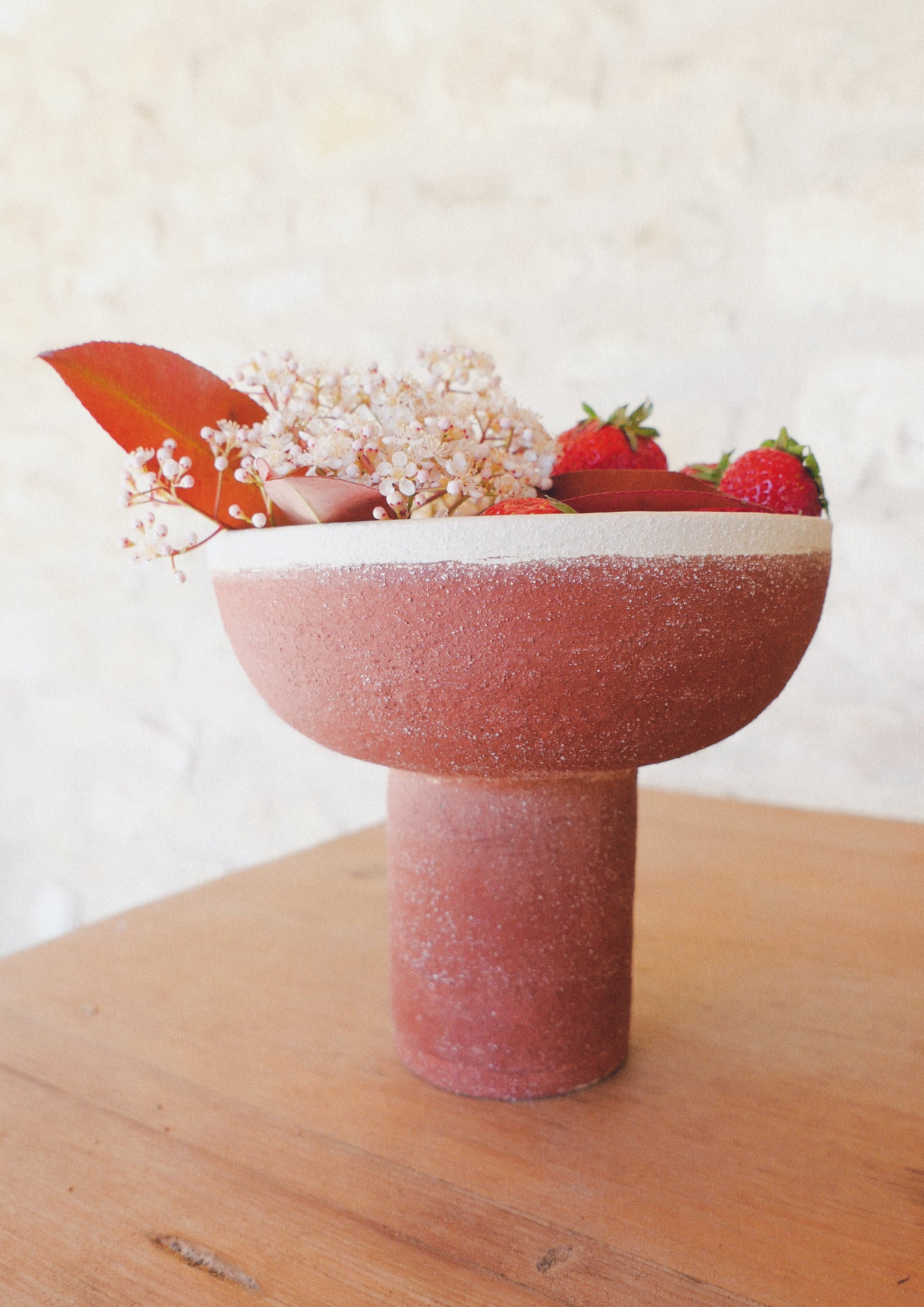 Façonné en grès blanc à chamotte fine (texturé) puis recouvert, à l'extérieur, d'une couche d'ocre naturel qui donne à la pièce cette couleur rouge profonde. Emaillé à l'intérieur.