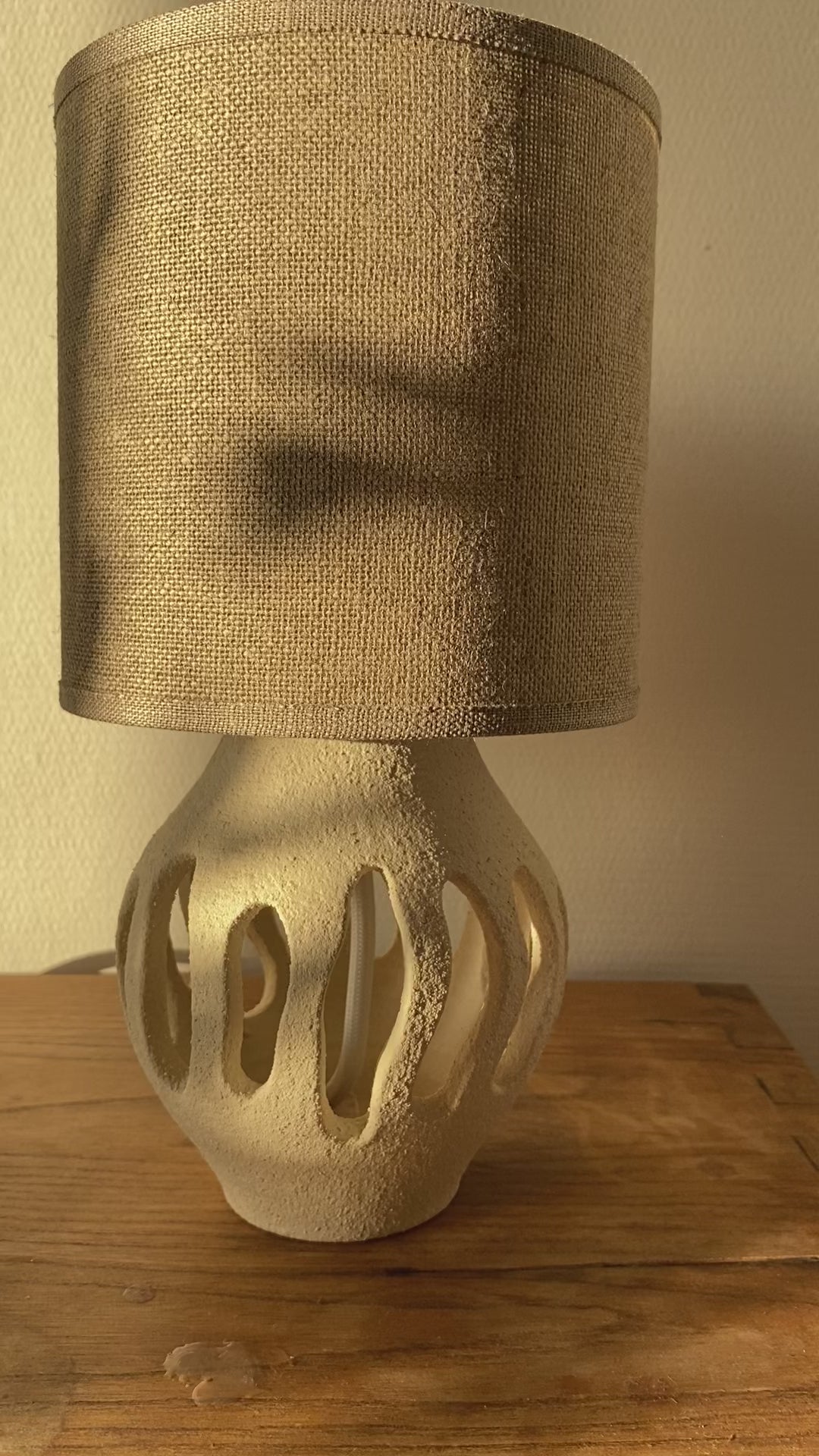 The base is raw, textured chamotte stoneware left unglazed, with hand-carved openings that catch sunlight by day and cast gentle patterns by night, reflecting the colors of its surroundings.