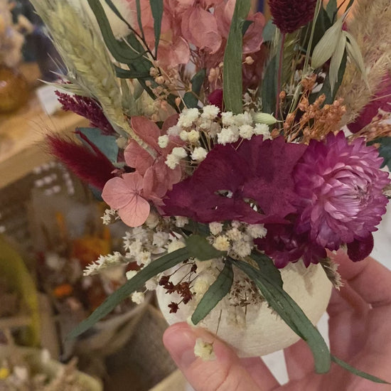 Il est percé sur le devant pour pouvoir piquer fleurs séchées, en papier ou fraîches.